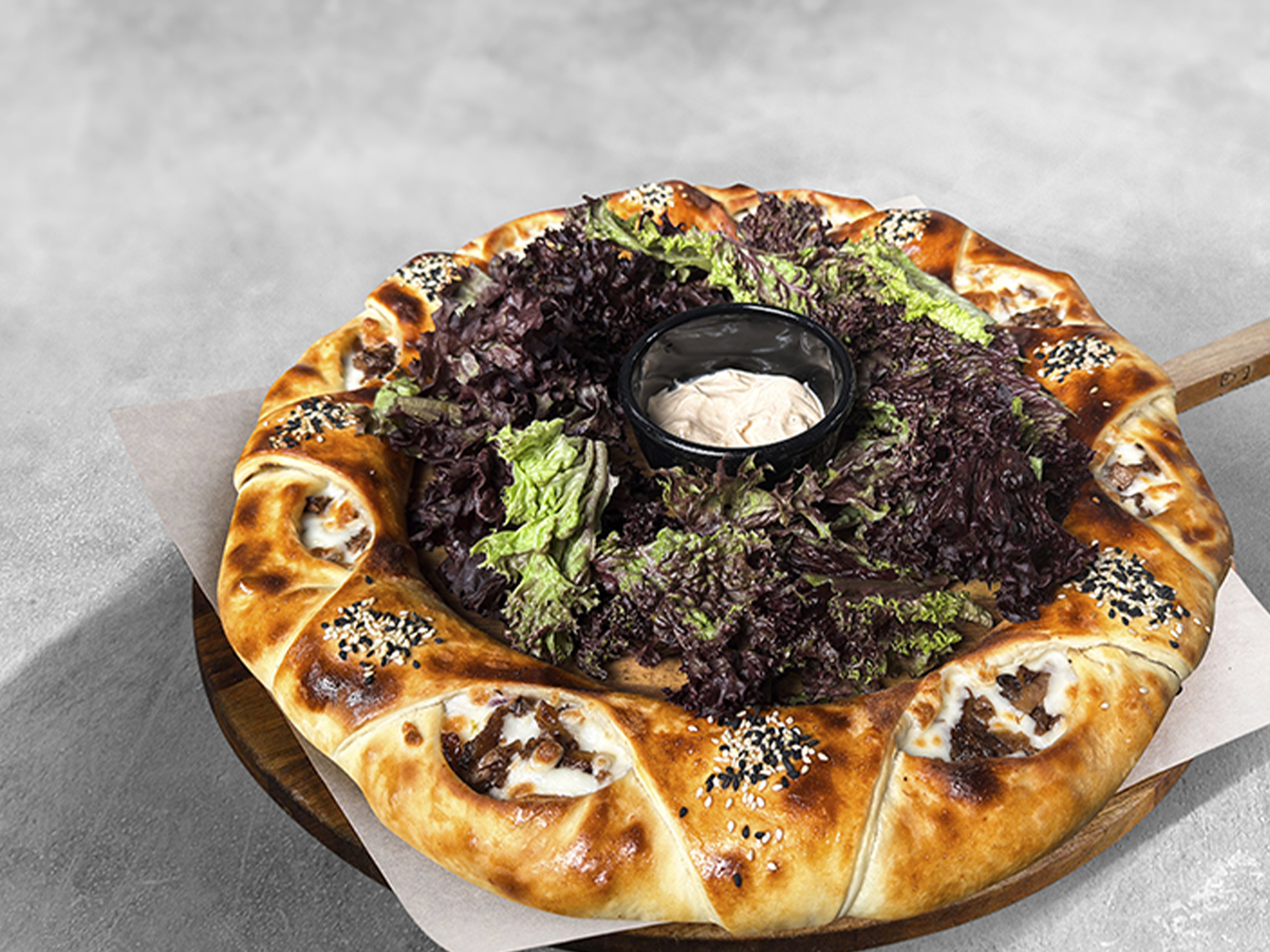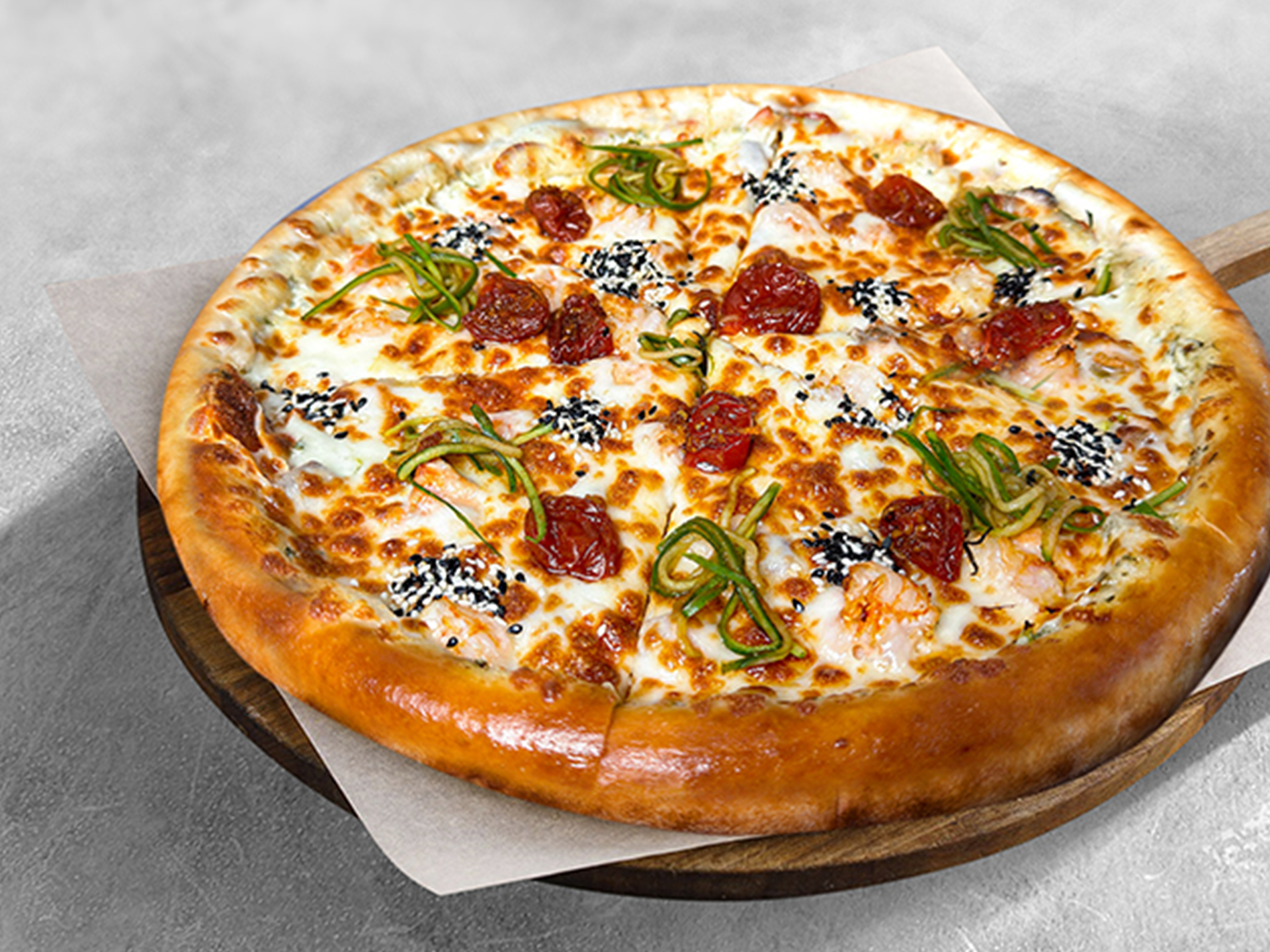 тесто, сливочный соус, соус барбекю ,моцарелла, томленная грудинка , салат томаты, лук красный, халапеньо