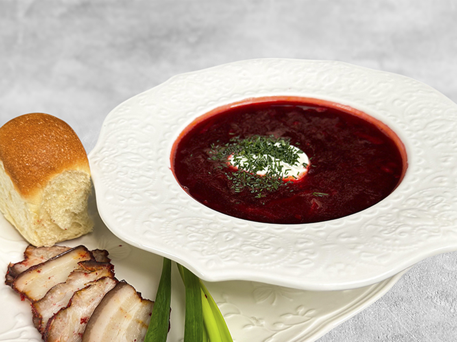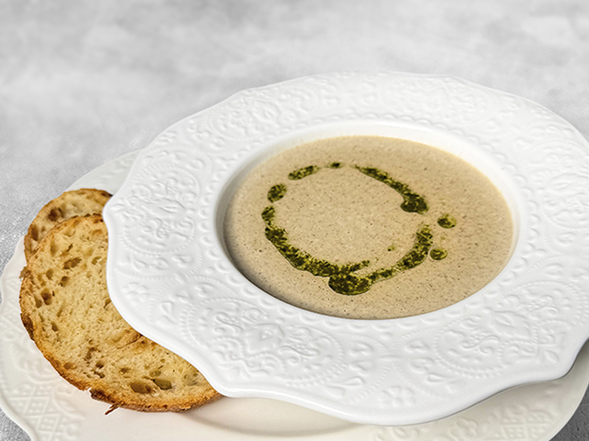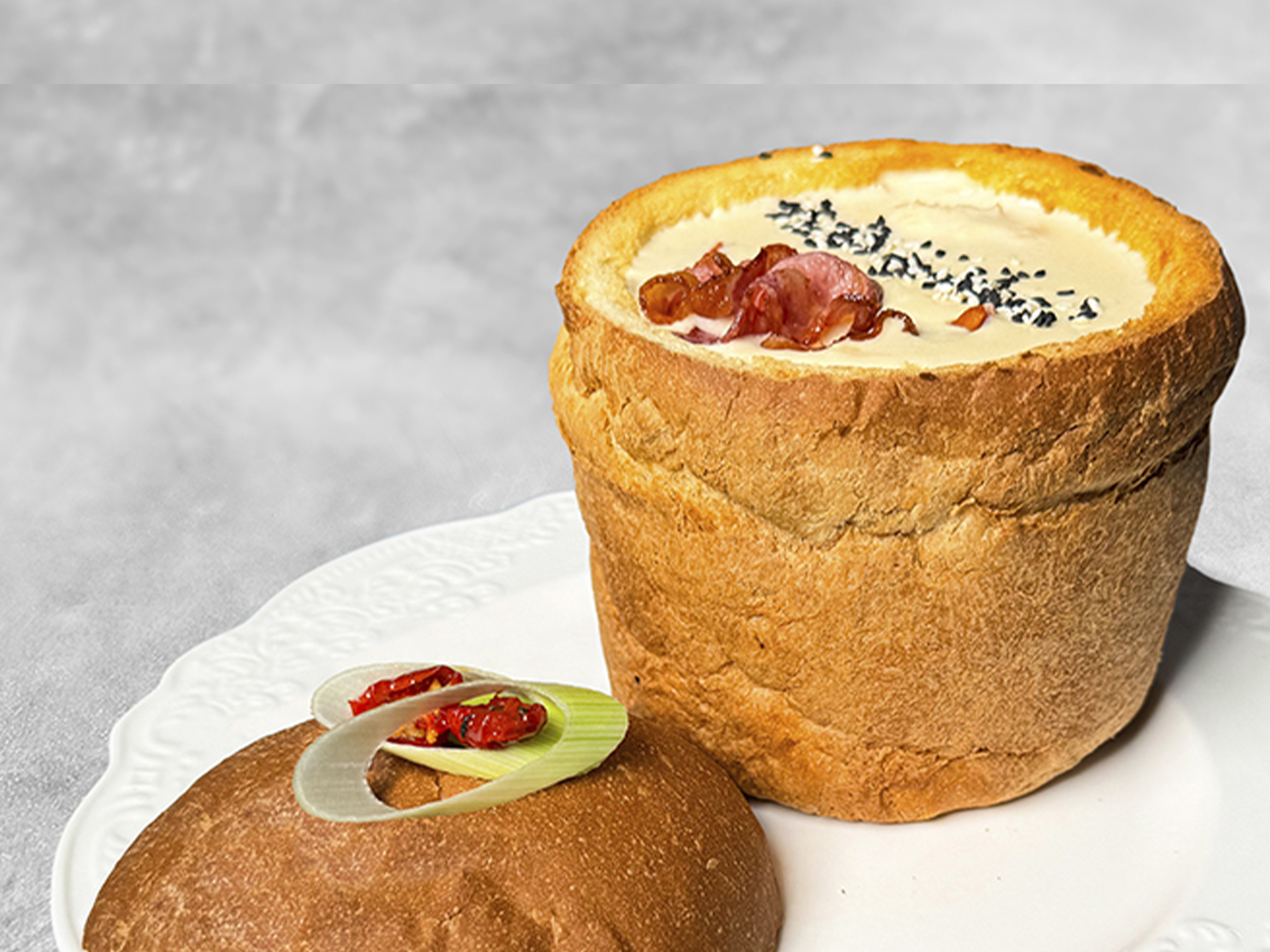 суп в пшеничном хлебе с горгонзолой, чеддером и жареным беконом