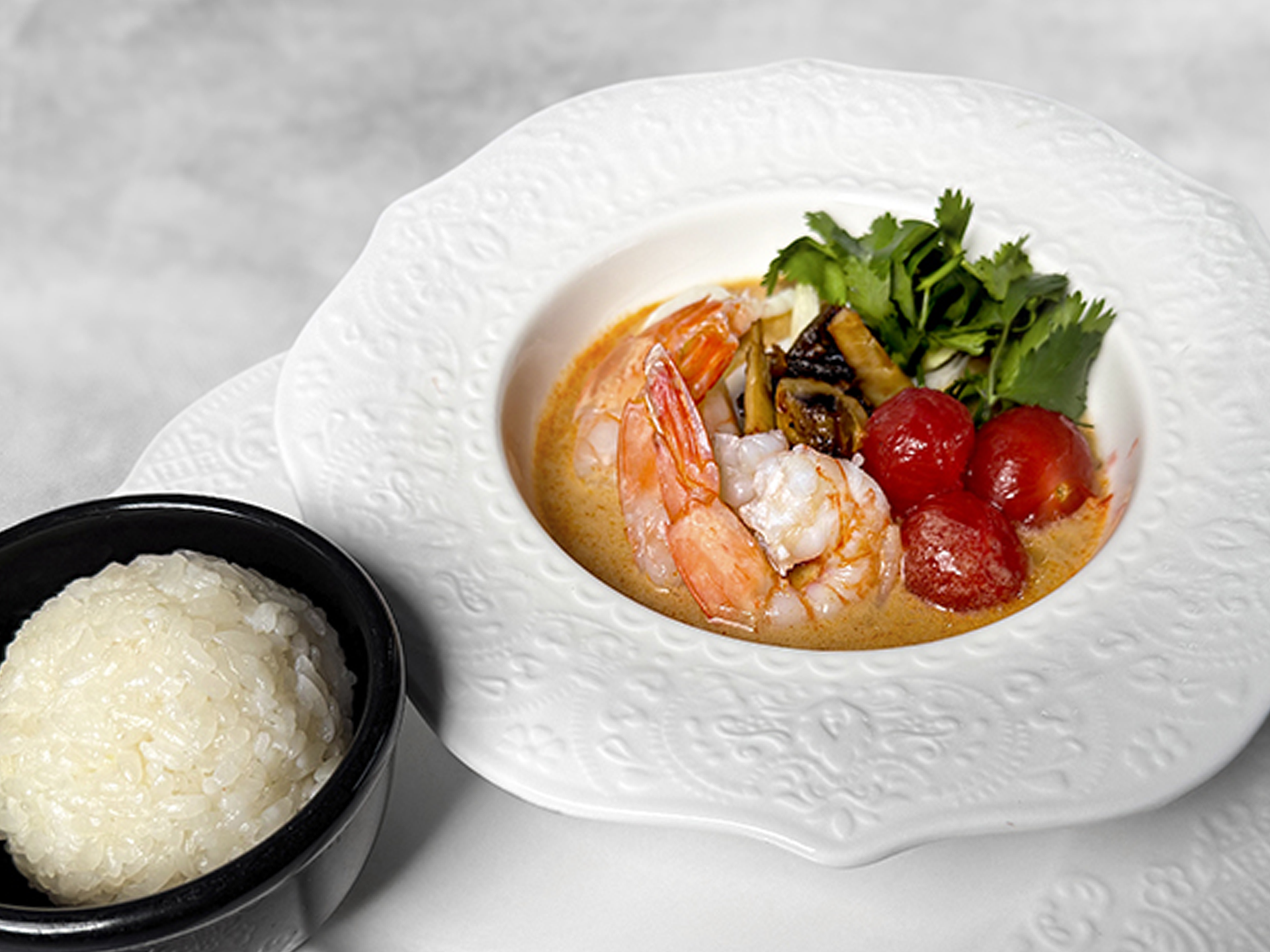 креветки, кальмары, грибы шампиньоны, томаты черри, кинза, рис