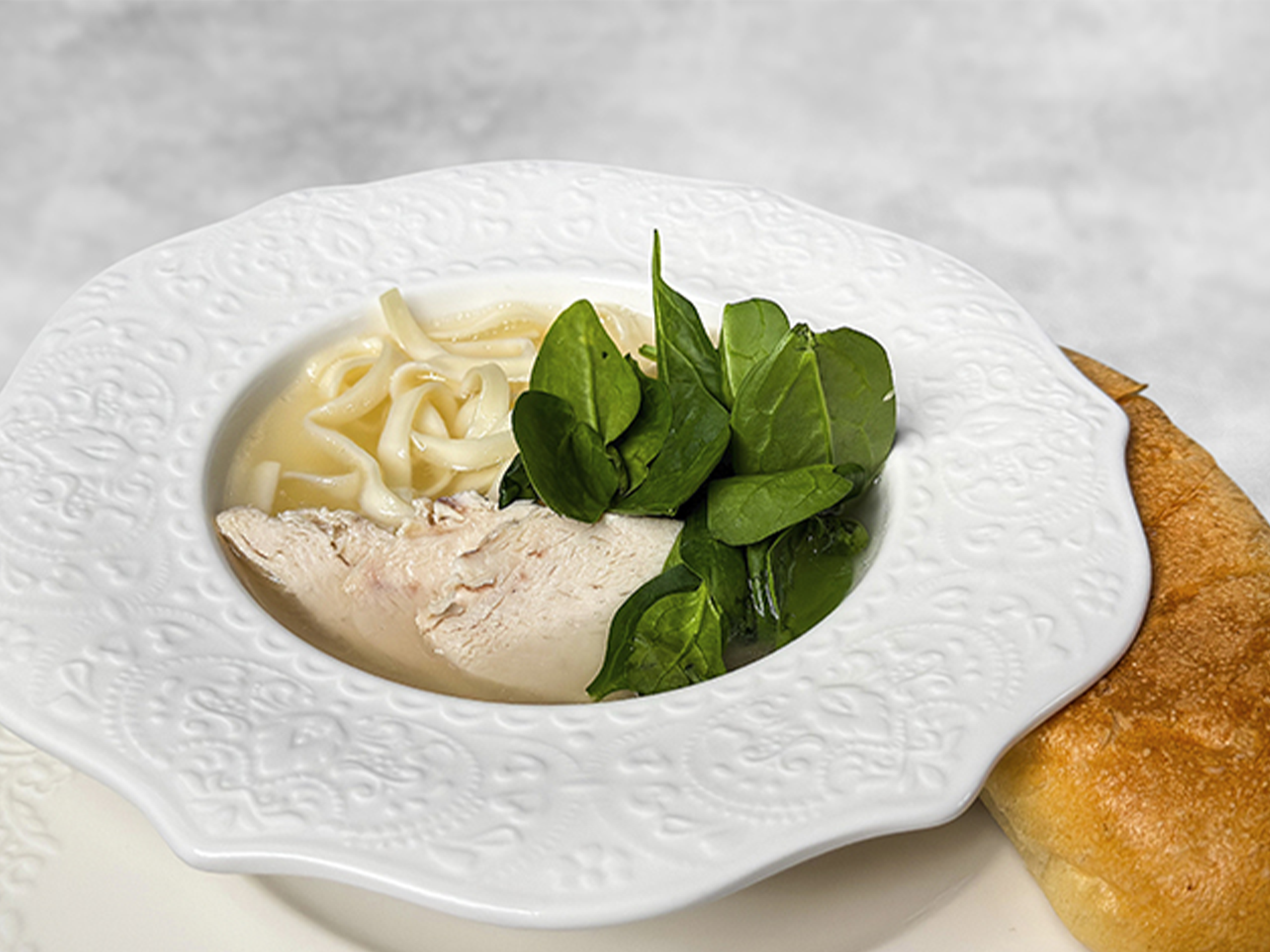 куриный бульон, шпинат, филе куриное, лапша, лепешка