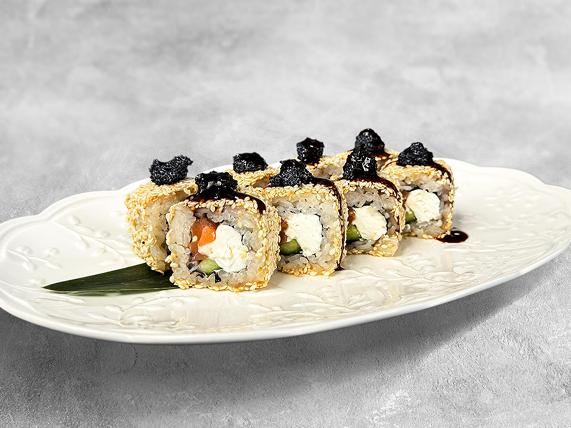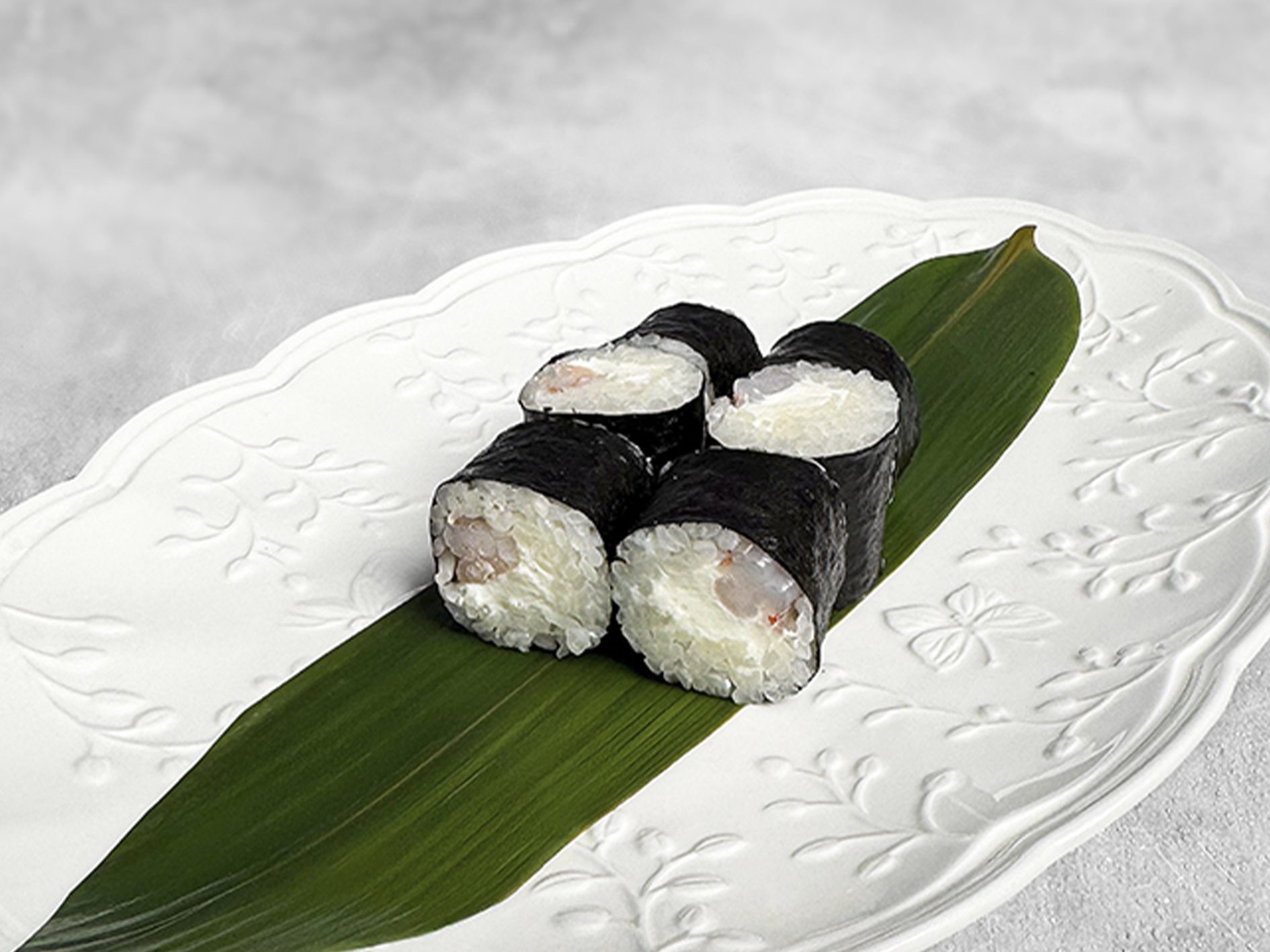 рис, сливочный сыр, огурец свежий, креветки тигровые, масаго, соус ореховый, яки соус, соевый соус, имбирь, васаби. 8 шт
