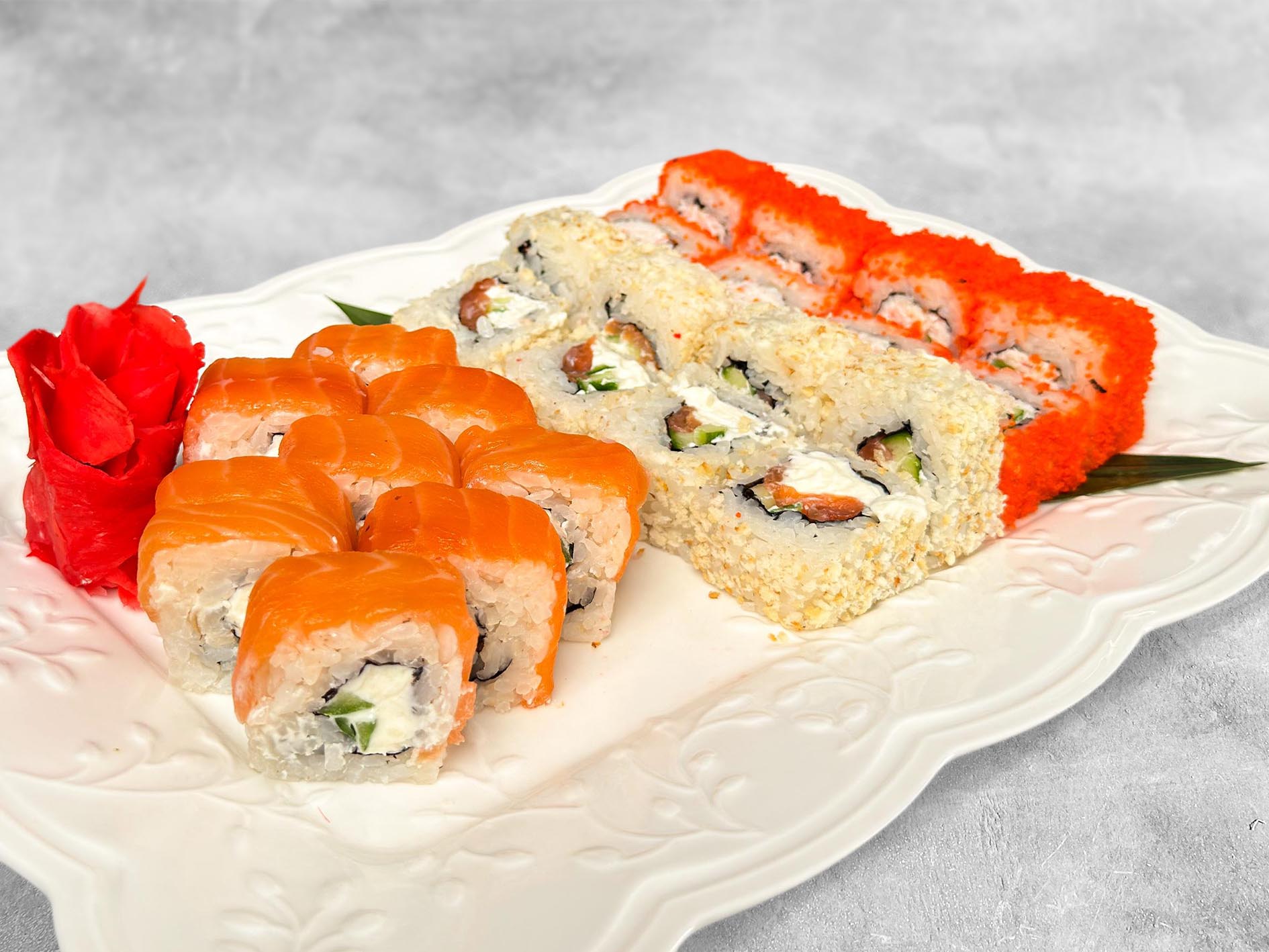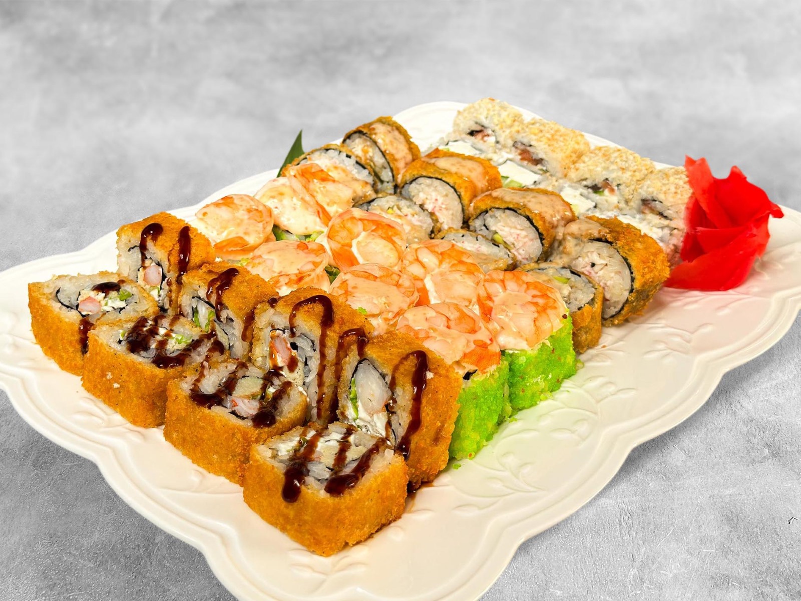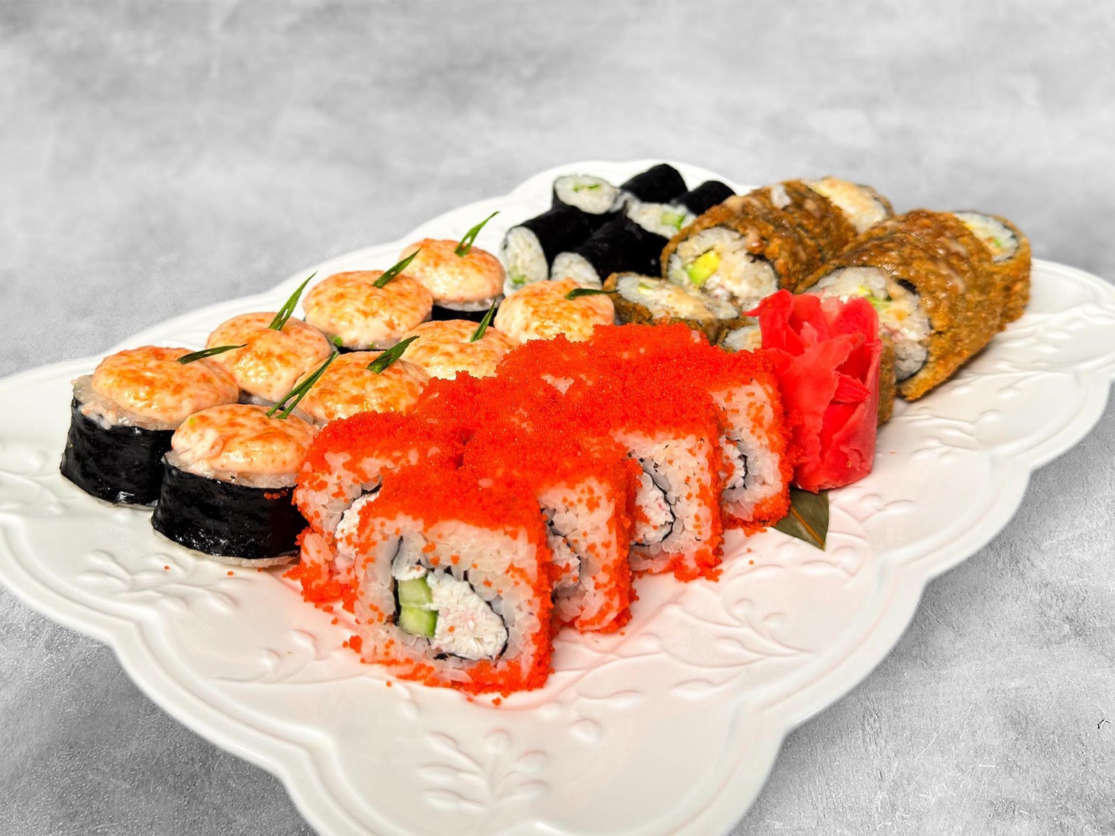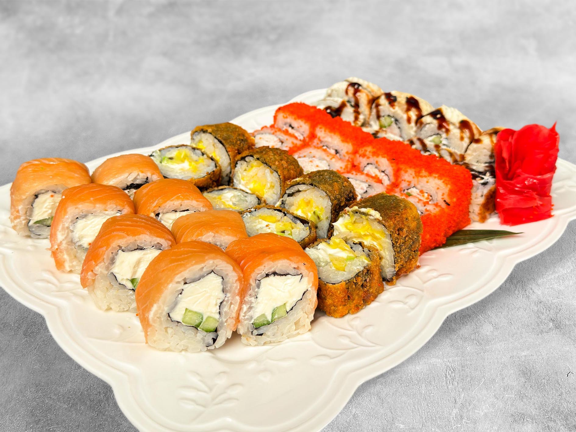32шт.: дары океана, четыре сыра, сегун, динамит, соевый соус, имбирь, васаби