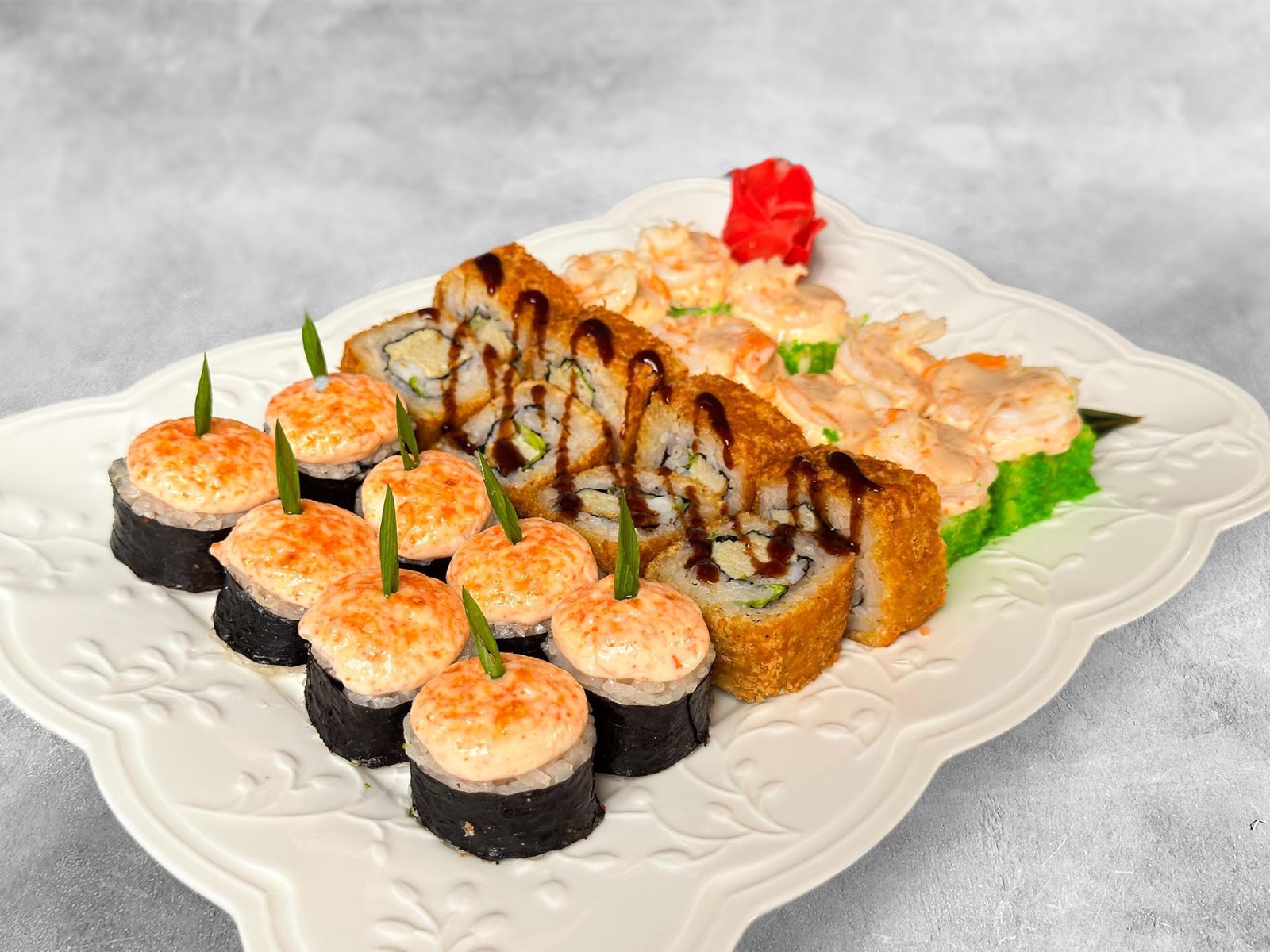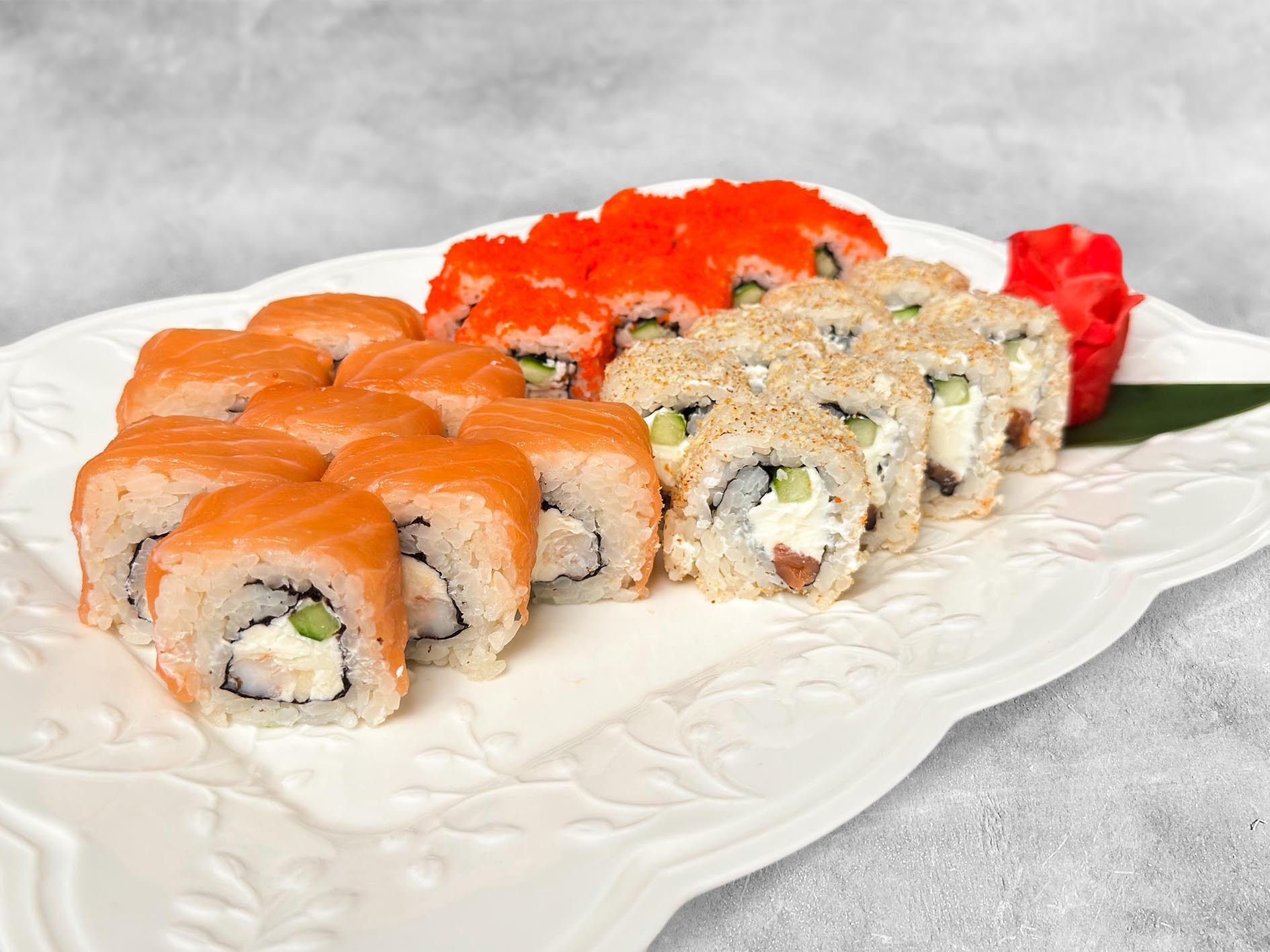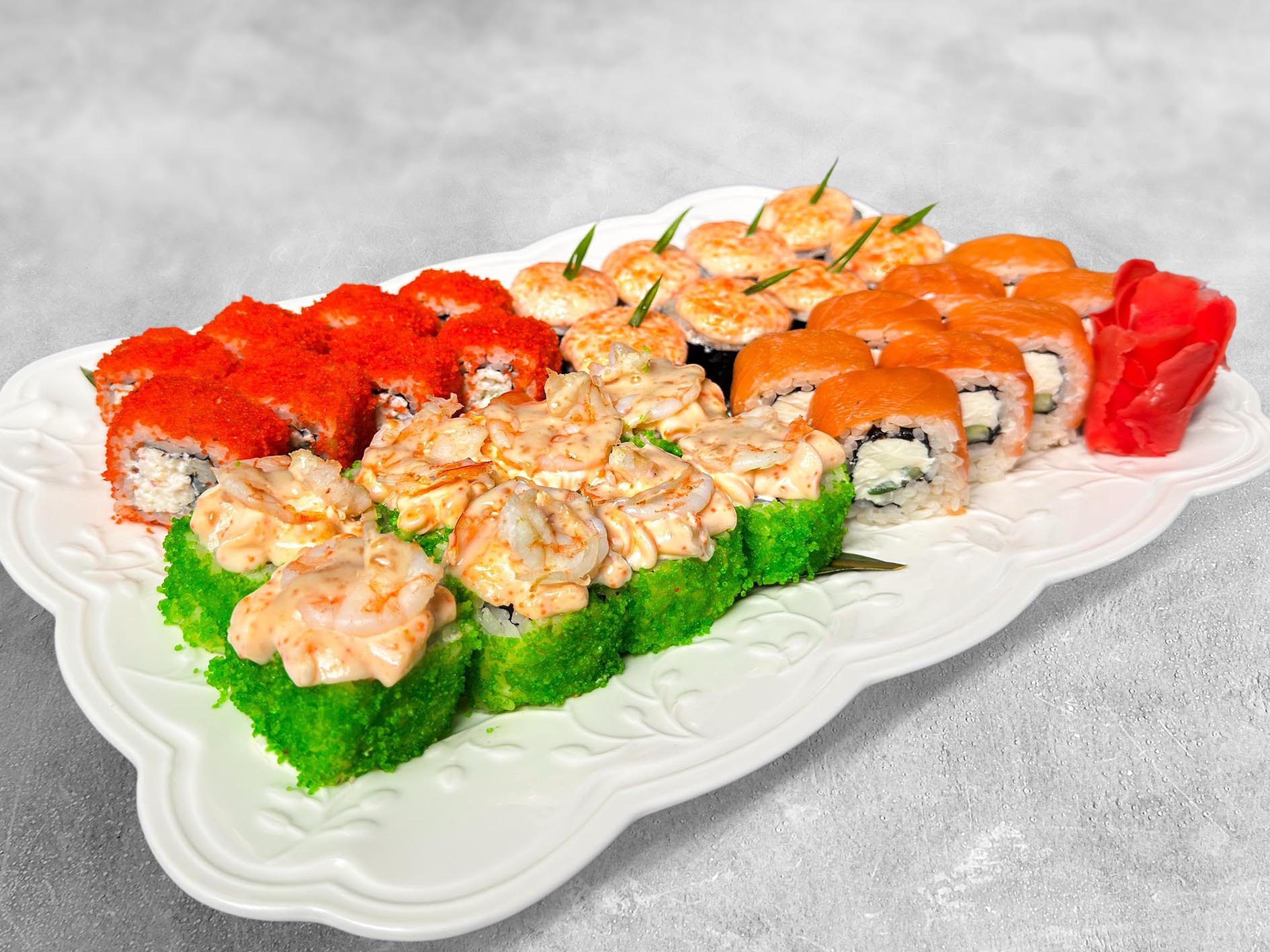 32шт.: дары океана, четыре сыра, сегун, динамит, соевый соус, имбирь, васаби