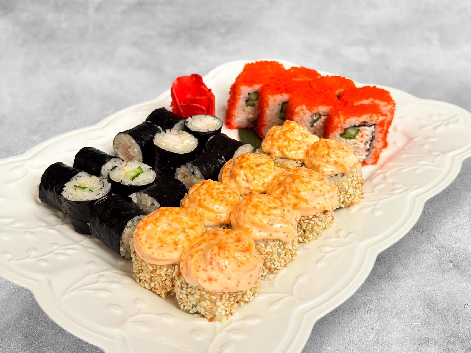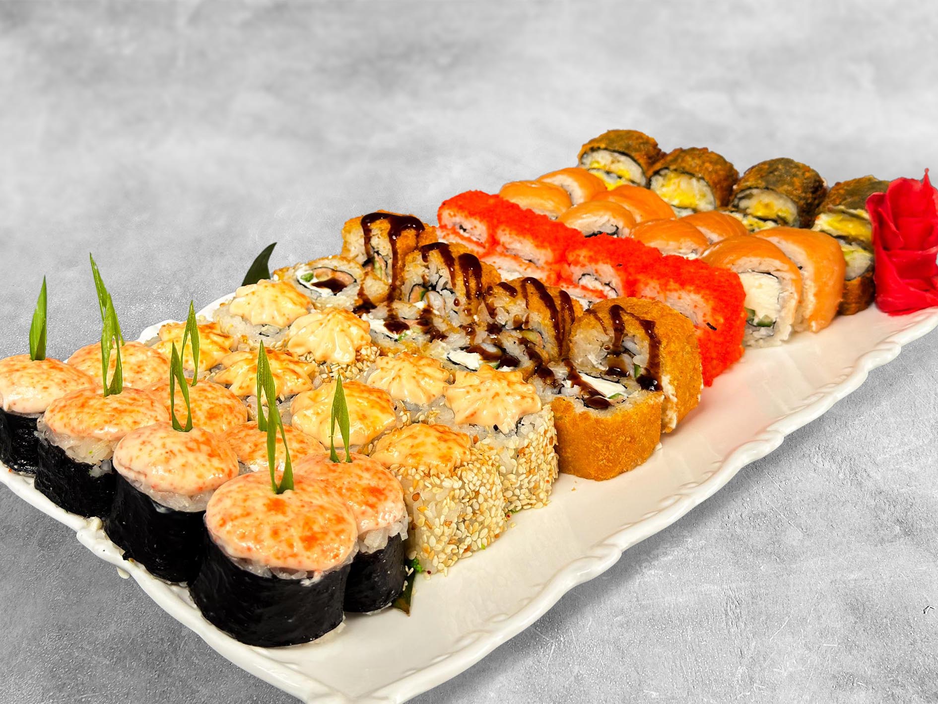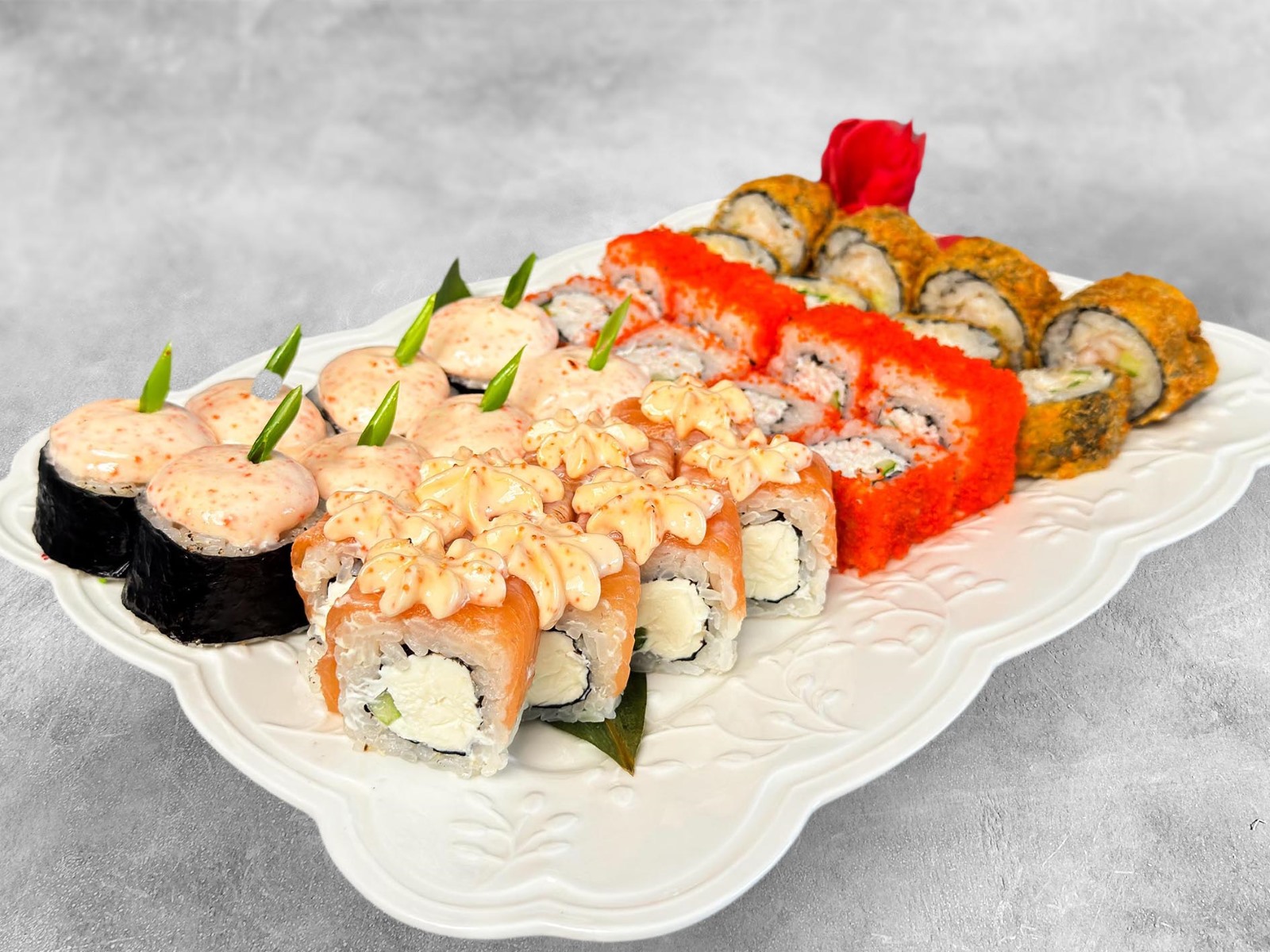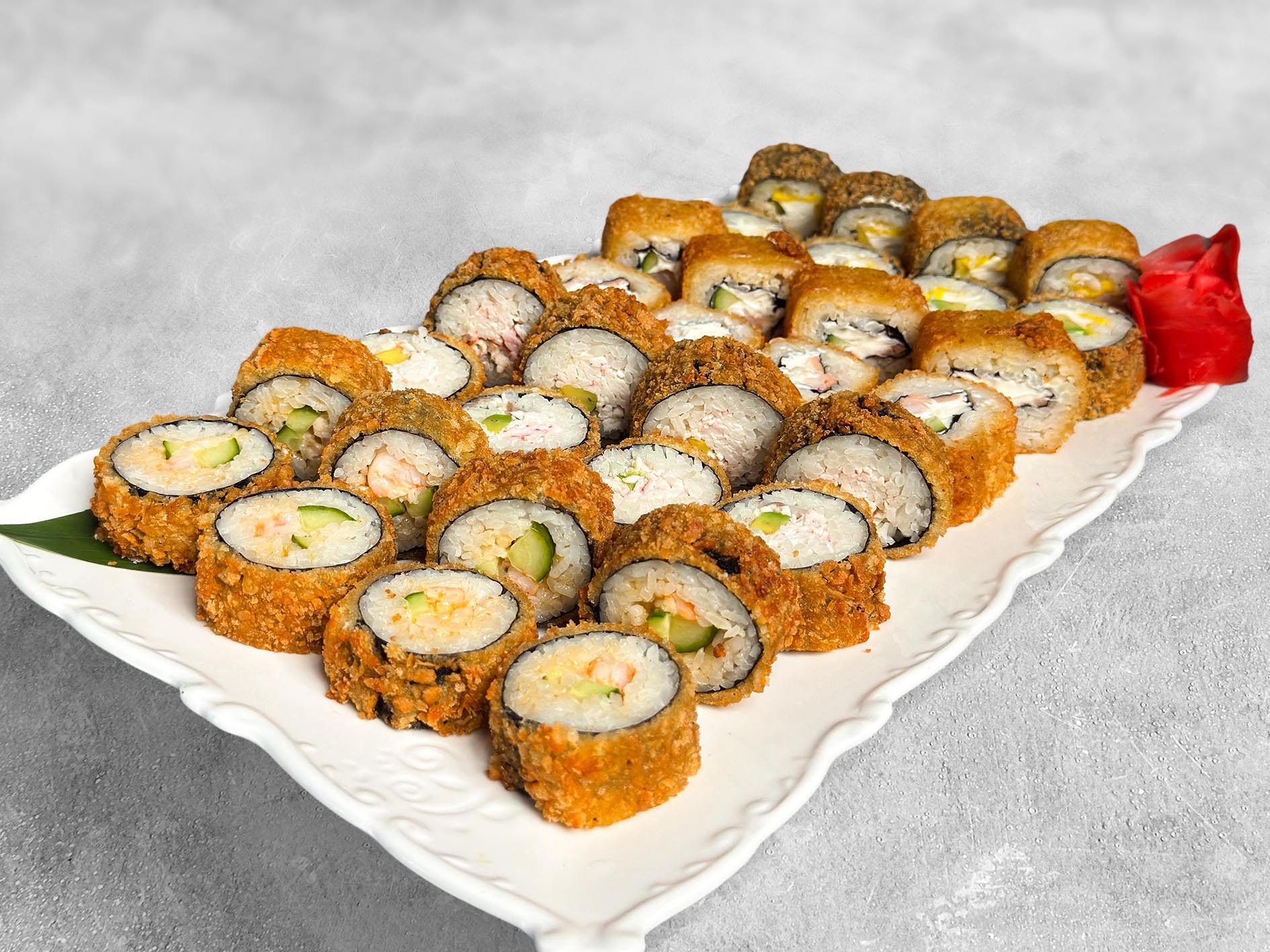 32шт.: дары океана, четыре сыра, сегун, динамит, соевый соус, имбирь, васаби