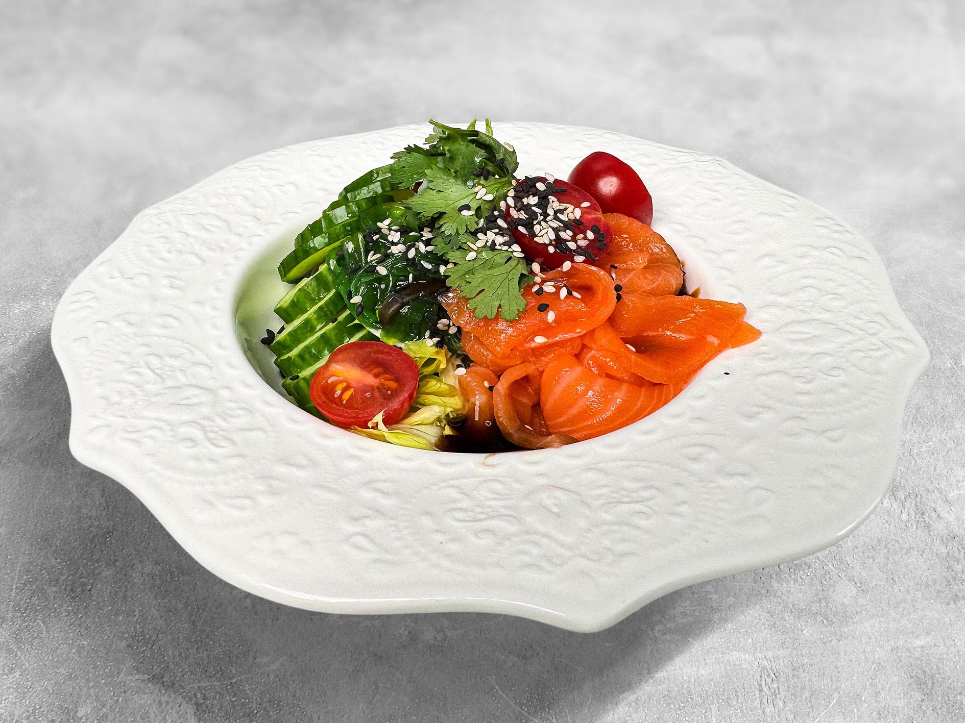 рис, лосось, авокадо, чука, салат айсберг, огурец, черри, соус ореховый, соус терияки, кунжут