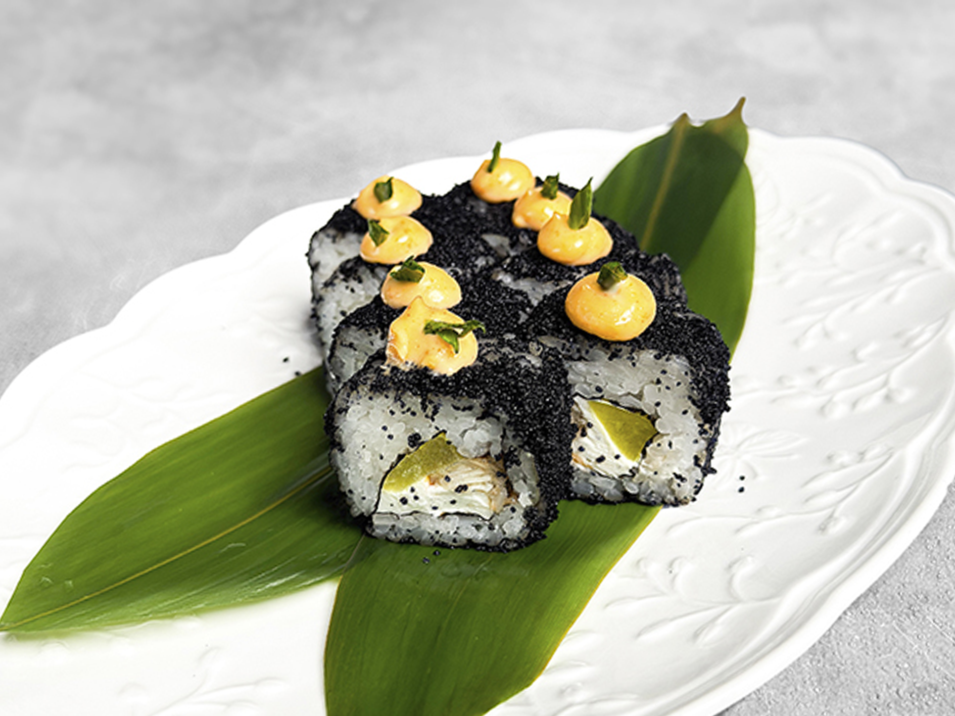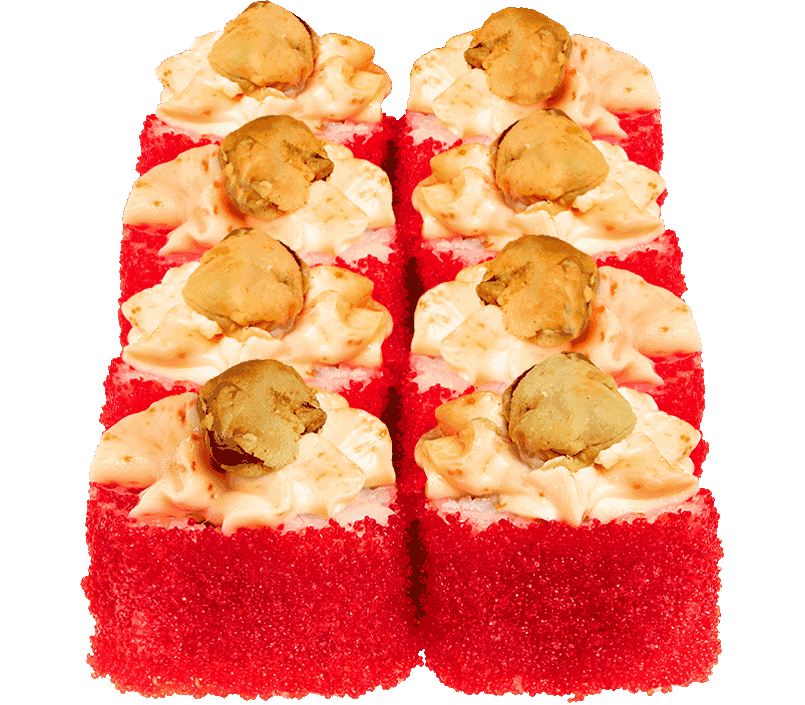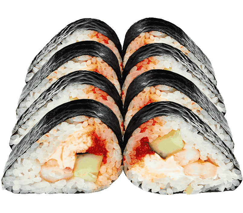 Рис, водоросли нори, майонез, огурец, авокадо, лосось, чёрная икра Масаго, соус спайси, зелёный лук, соевый соус, имбирь, васаби. 8шт