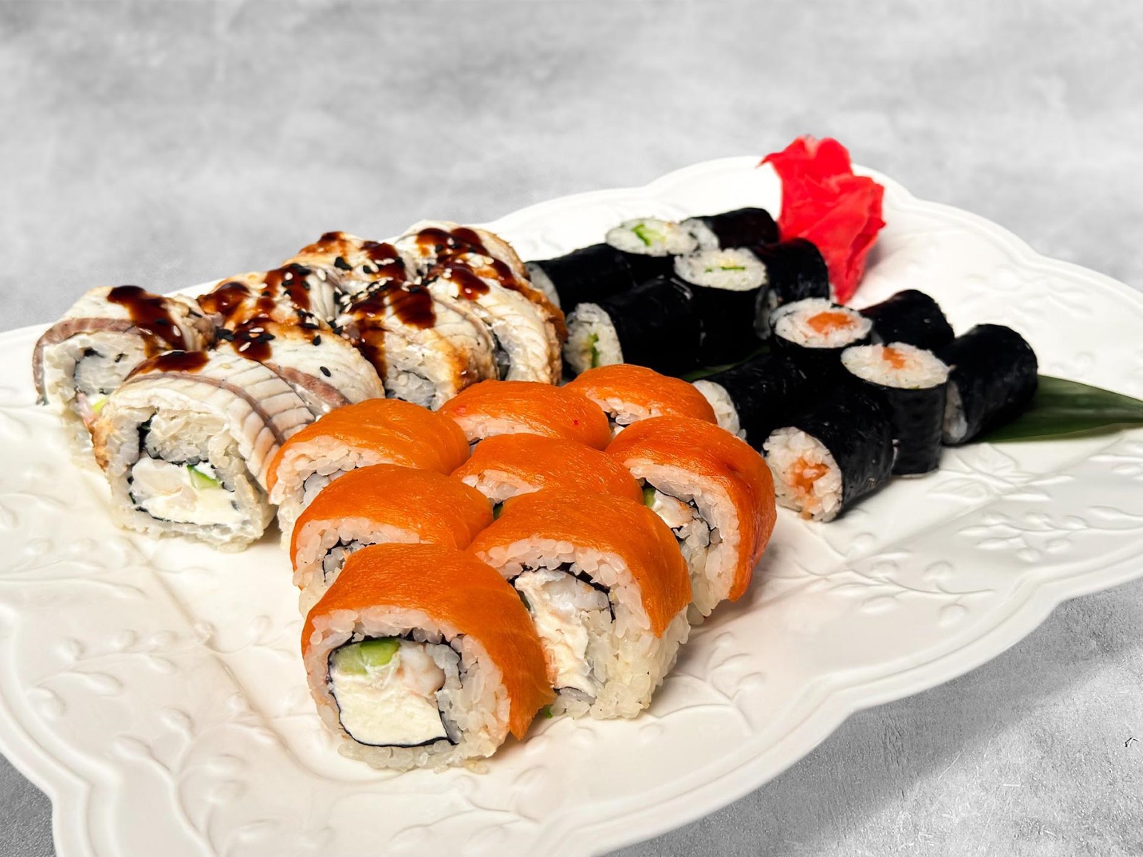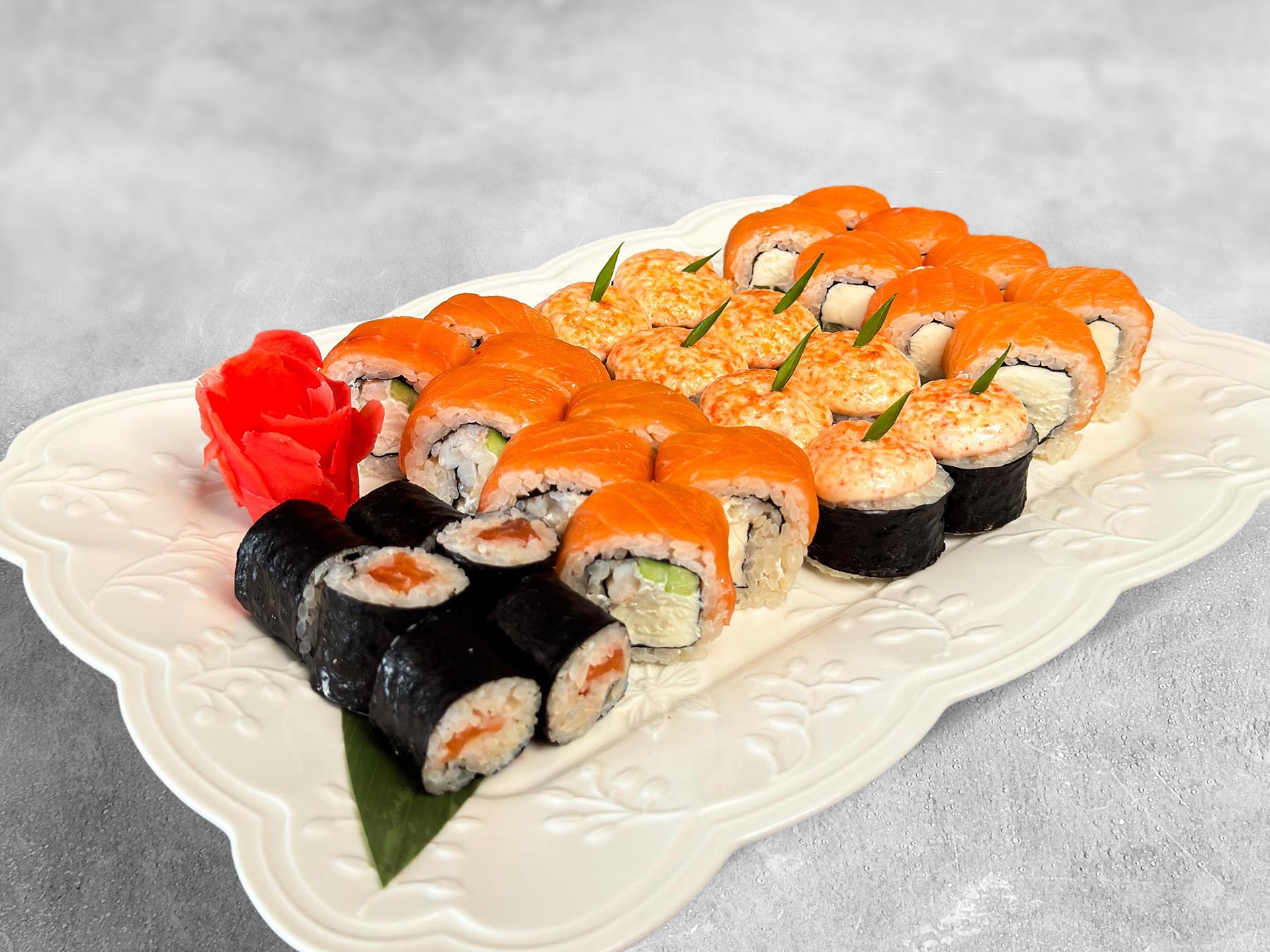 30шт.: филадельфия, филадельфия с креветкой, сяки маки, яки чузу, соевый соус, имбирь, васаби