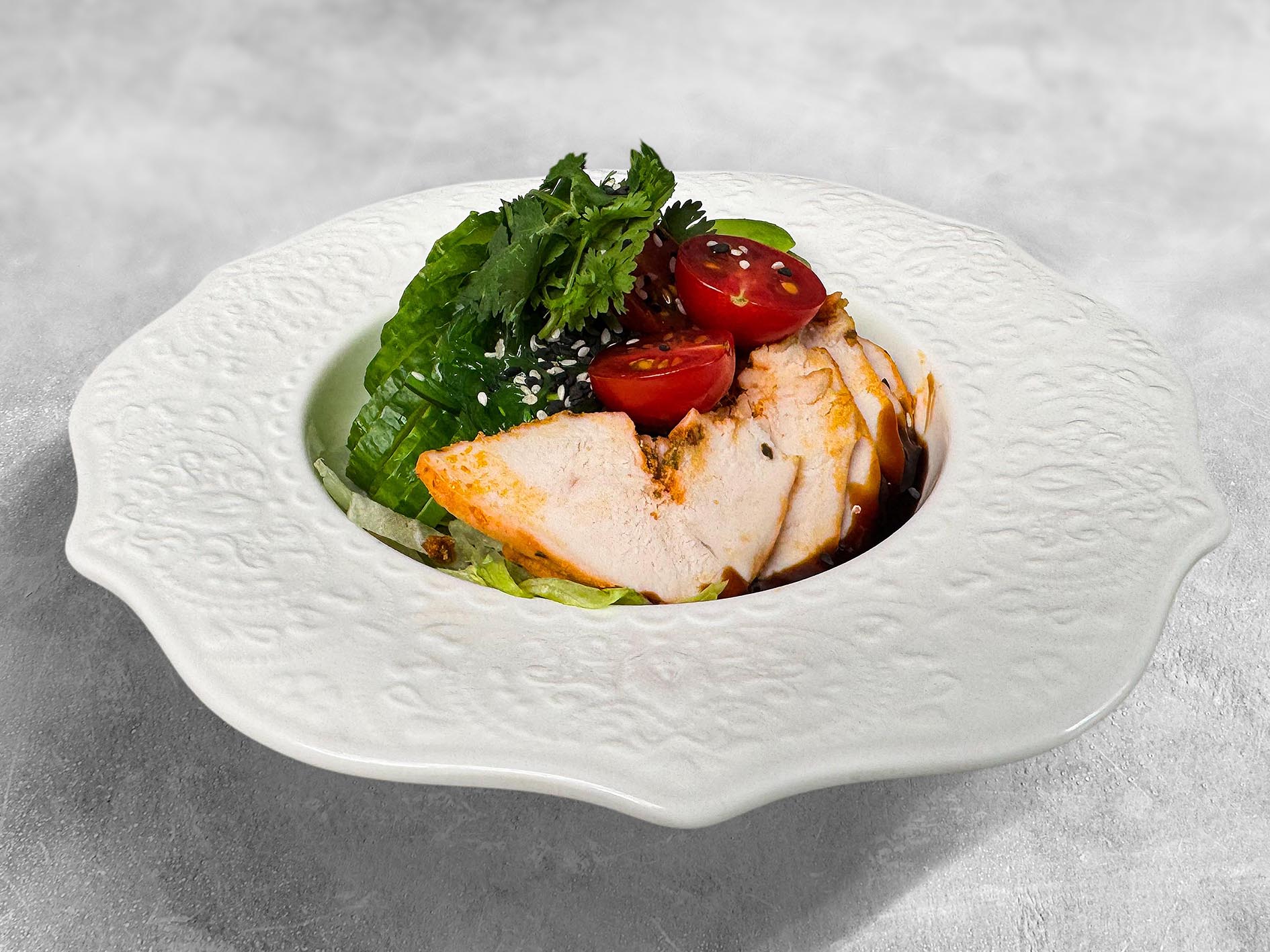 рис, курица, авокадо, чука, огурец, черри, салат айсберг, соус ореховый, соус терияки, кунжут