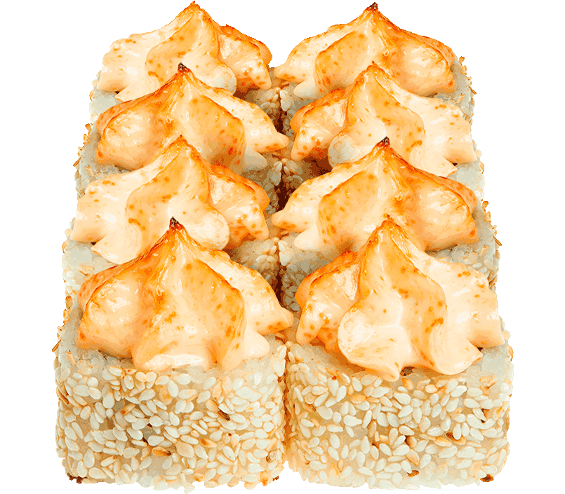 рис, сливочный сыр, запеченный лосось, свежий огурец, яки соус, соевый соус, имбирь, васаби. 8 шт